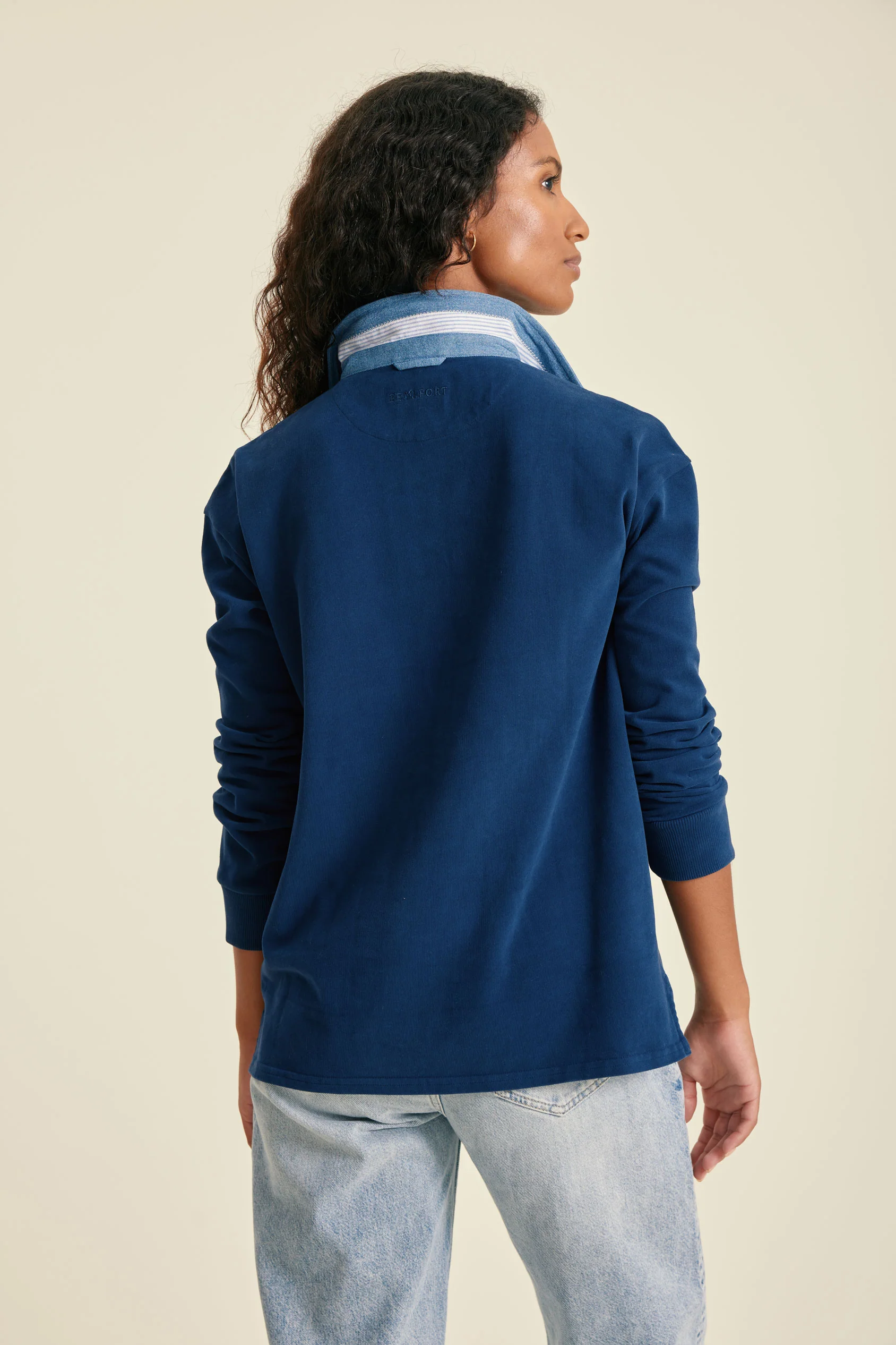 - Soft cotton rugby with striped inner-collar twill detailing