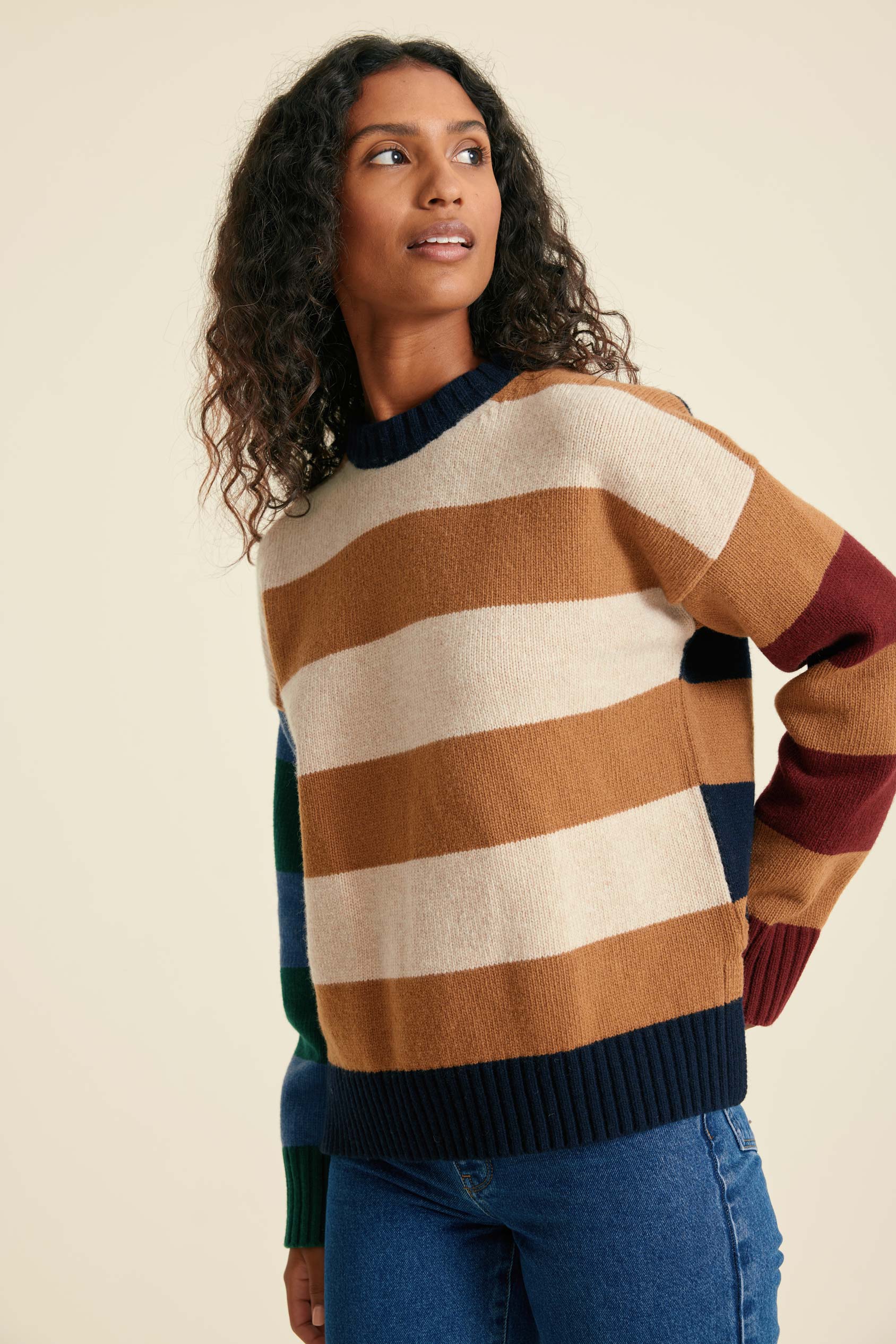 - Crew neck jumper with rib detail and an all-over multi colourblock stripe design