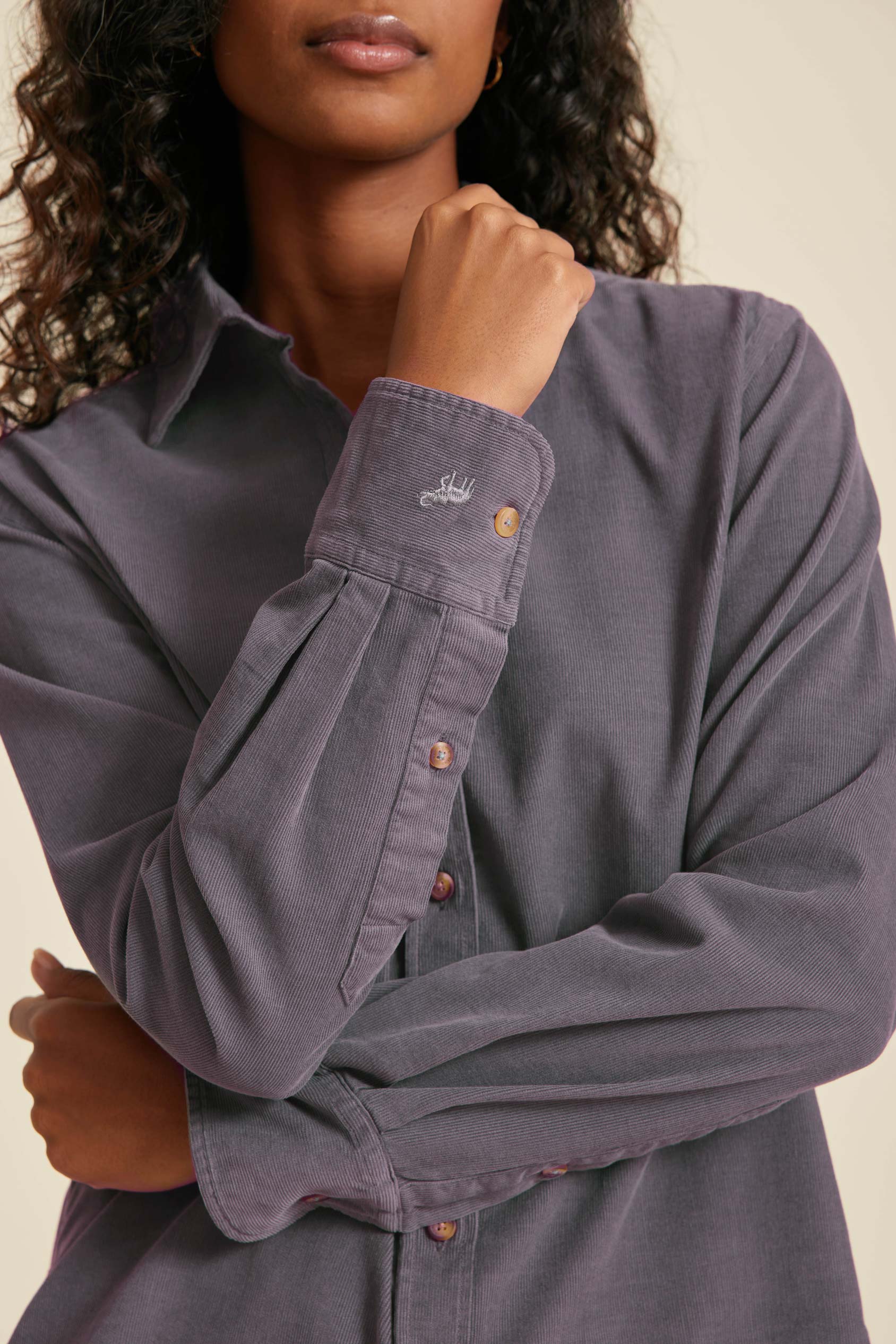 - Fine needle cord shirt with a centre back box pleat and curved hem for ease